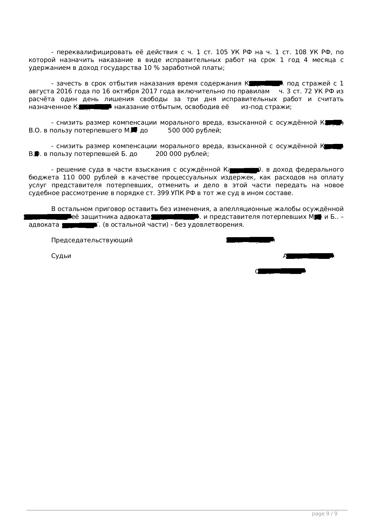Благодаря работе адвокатов, гражданин получил условное наказание по ч. 1 ст. 105 УК РФ. Суть: осуждённый в ссоре нанёс потерпевшему 4 удара ножом, в результате потерпевший умер. Осуждённый признал вину.