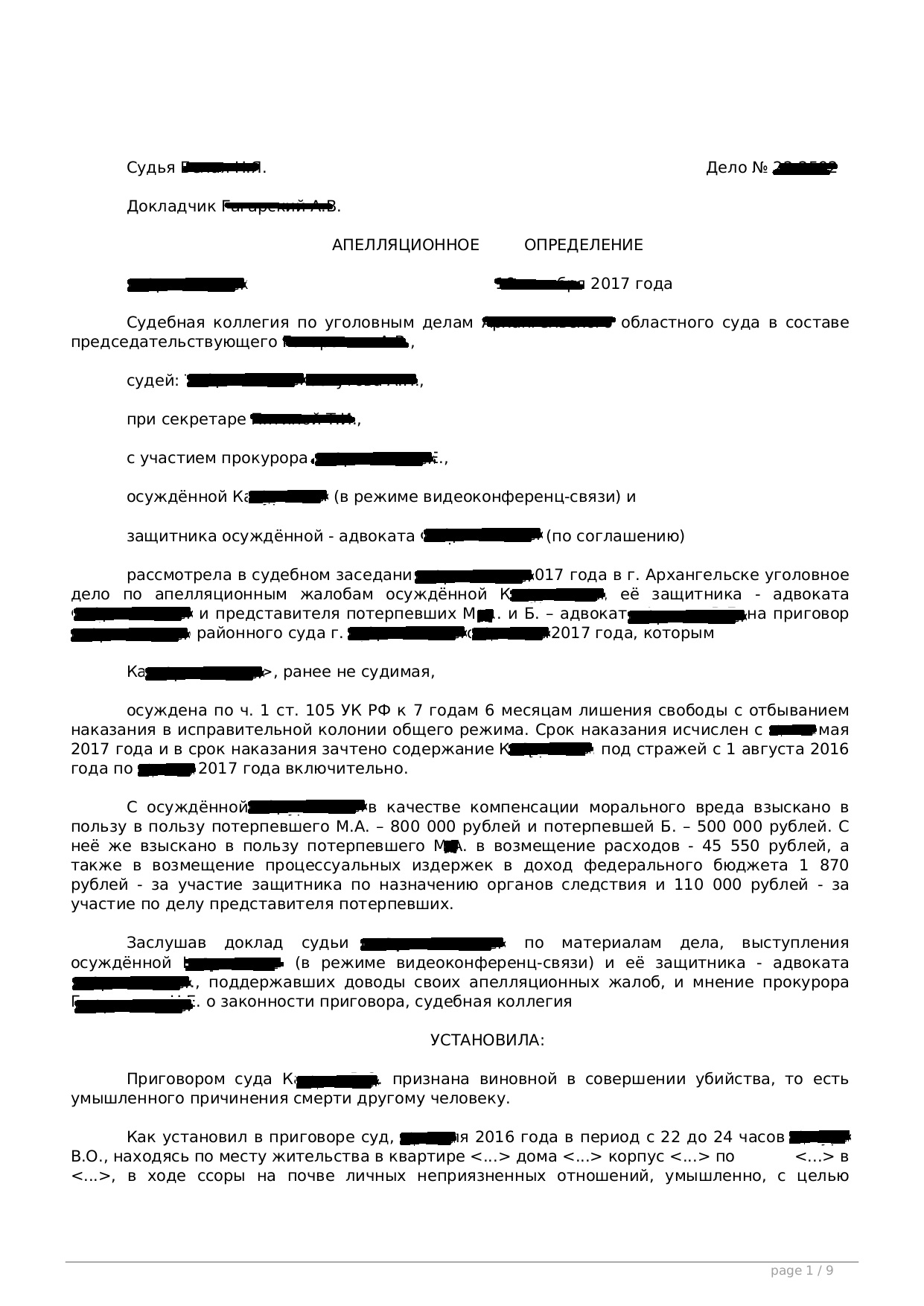 Чем помогает адвокат по статье 105 УК РФ потерпевшей стороне? В первую очередь восстановить справедливость и наказать виновного. Адвокат добивается максимум наказания для преступника. Добивается возмещения вреда.